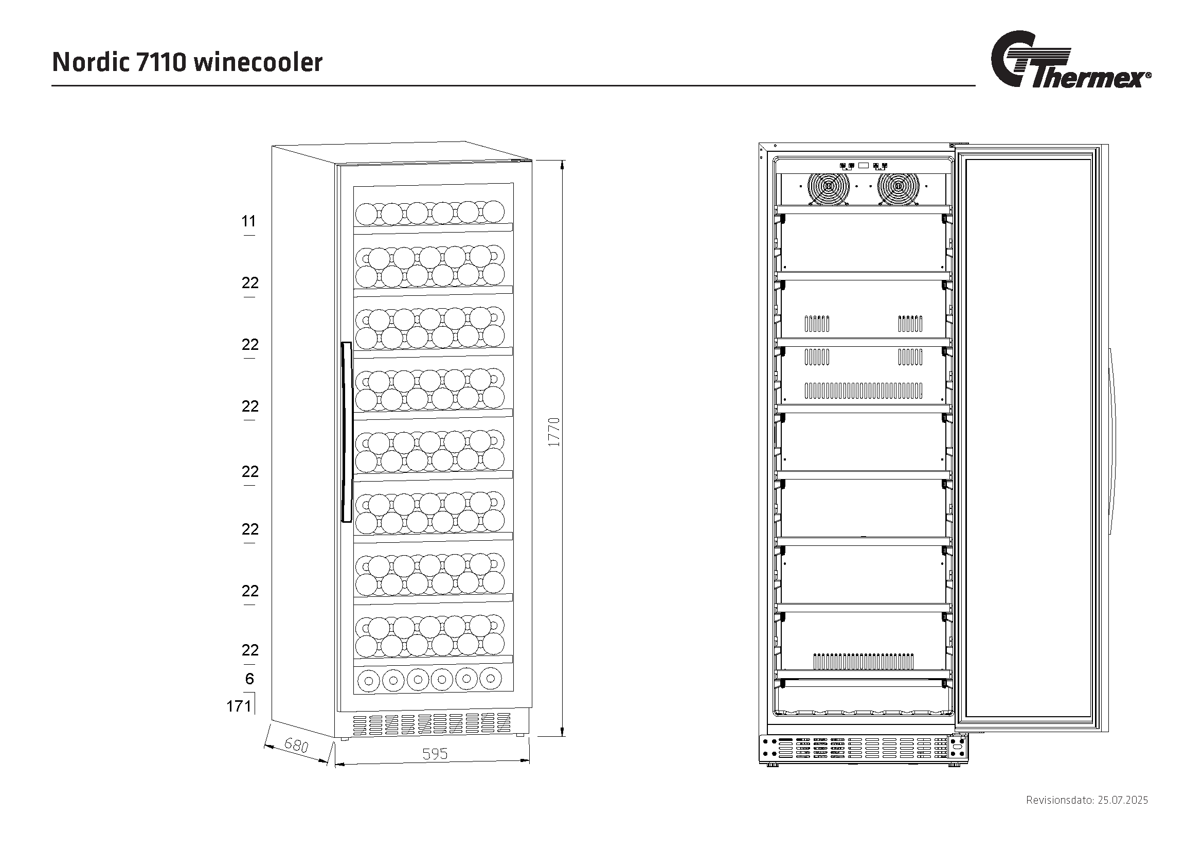 Nordic 7110 från Thermex är en stilren och elegant fristående vinkyl, skapad för vinälskare som vill ha både funktionalitet och ett exklusivt utseende. Med sin svarta glasram och klara glas i mitten får du en fri utsikt över dina viner, medan det svarta handtaget och de ljusa trähyllorna skapar en fin kontrast till skåpets mörka exteriör.