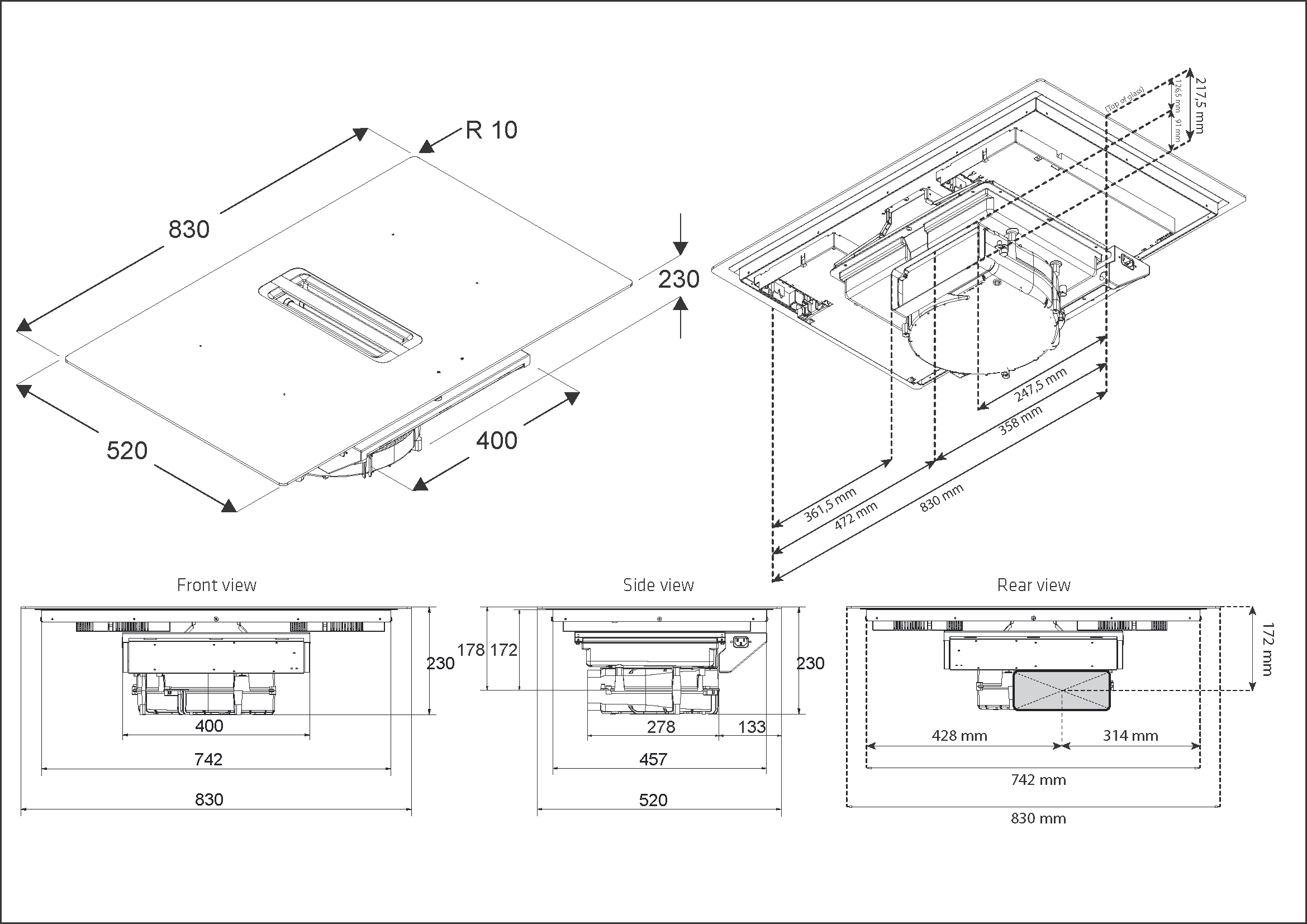 Trots den integrerade utsugningsmotorn tar hällen upp minimalt med plats i köksskåpet. Med en höjd på endast 23 cm finns det gott om plats för lådor eller extra förvaring under Point Hurricane.