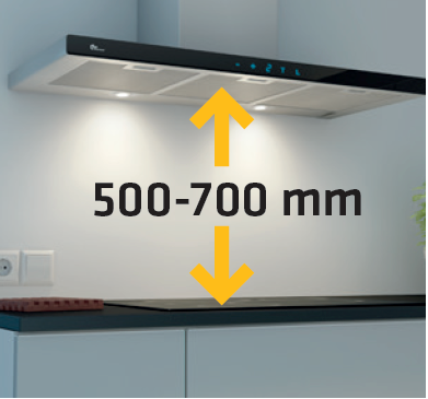THERMEX rekommenderar att du monterar din köksfläkt 500-700 mm över spisen. Tänk på att alltid ta hänsyn till myndighetskrav och specifikationer för spis och köksfläkt.